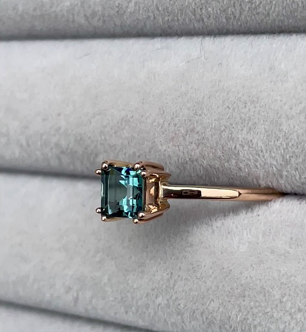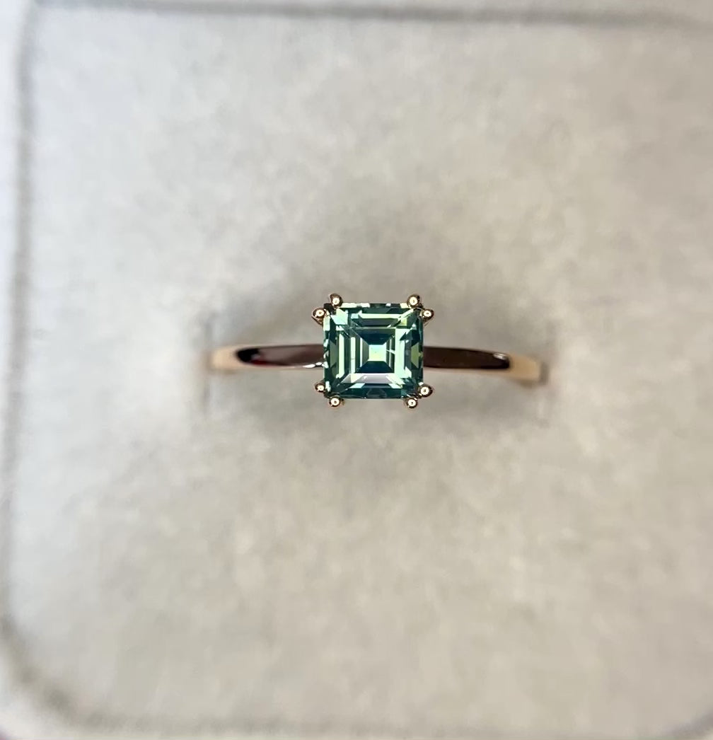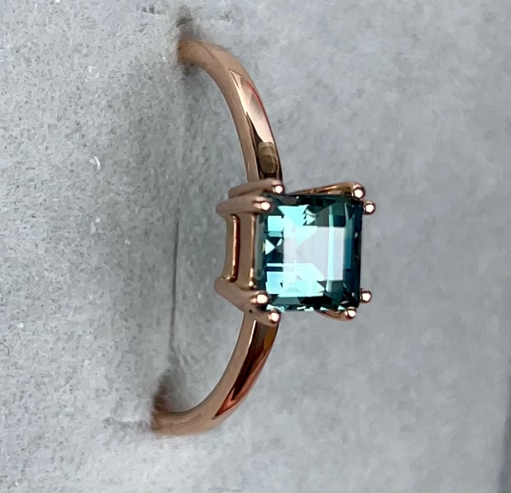 优雅戒指,镶嵌一颗1.00克拉天然青绿色蓝宝石,周围环绕闪耀的天然白色蓝宝石,镶嵌于实心18K玫瑰金戒指托中。
