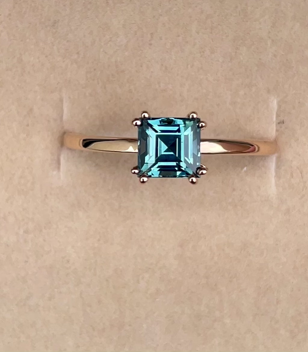 这款优雅的戒指镶嵌了一颗1.00克拉 天然青绿色蓝宝石,周围环绕着闪耀的无冲突天然白蓝宝石,镶嵌在坚固的18K 玫瑰金戒指托中。这款戒指的永恒经典设计将使您的订婚难以忘怀。